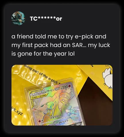 e-pick is an innovative online sales platform specifically designed for trading card game collectors. Users can purchase items by "opening" e-pick's original mystery boxes. Once you acquire an item, you have two options: you can exchange it for points via our buyback offer, or you can redeem it to have it delivered right to your doorstep!